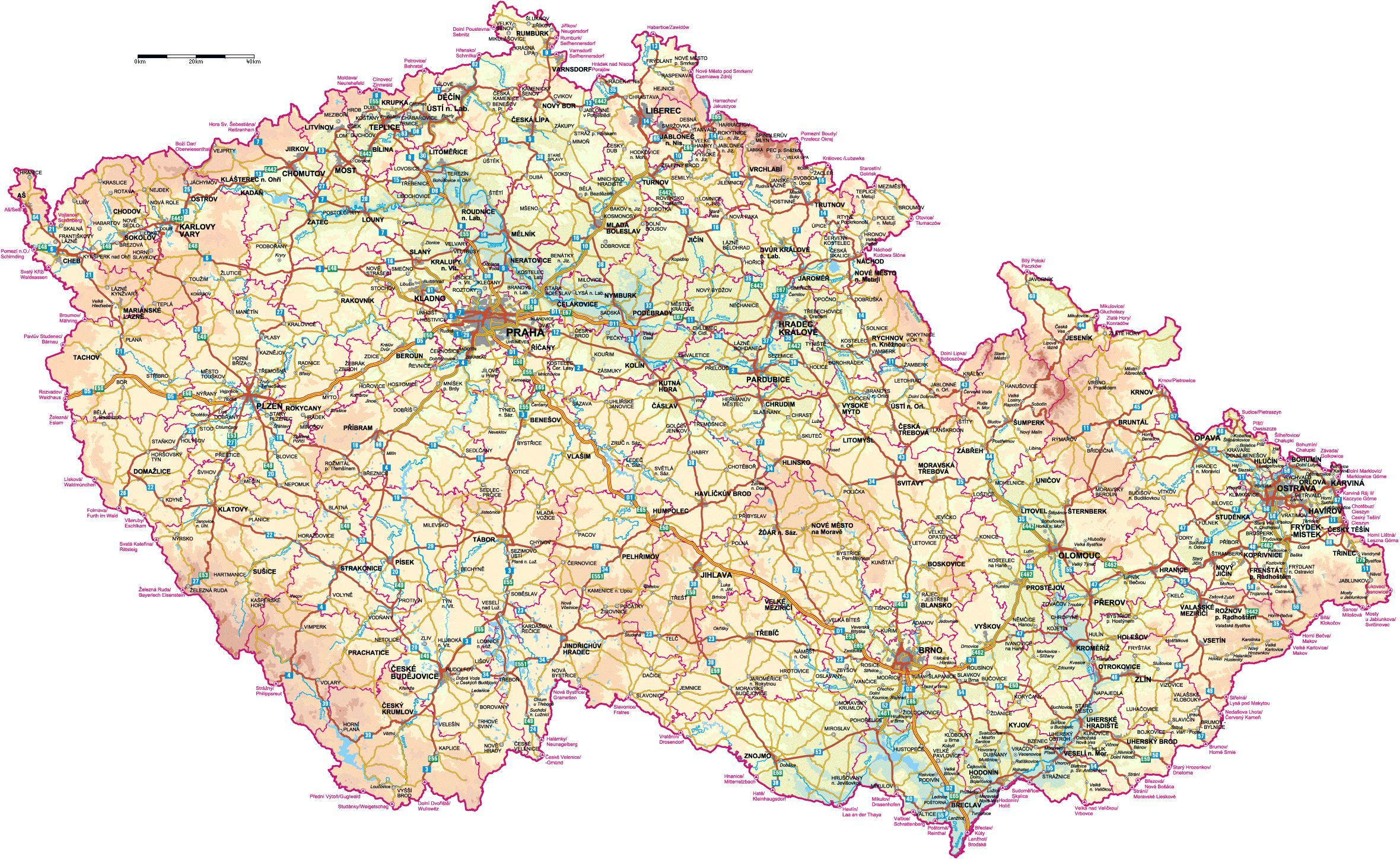 Map of CZ. CZ map (Eastern Europe - Europe) to print. CZ map (Eastern Europe - Europe) to download. There are a small number of cities with population of more than 100,000 inhabitants and Prague is the only city with population of more than 1 million as its shown in CZ map. There are a large number of small and medium-sized cities. Mountains along most of the state border enclose the area of the CZ and limit the influence of the CZ metropolitan areas across the border. Economic development is in some areas limited by the transport network that is either insufficient or of a bad quality.