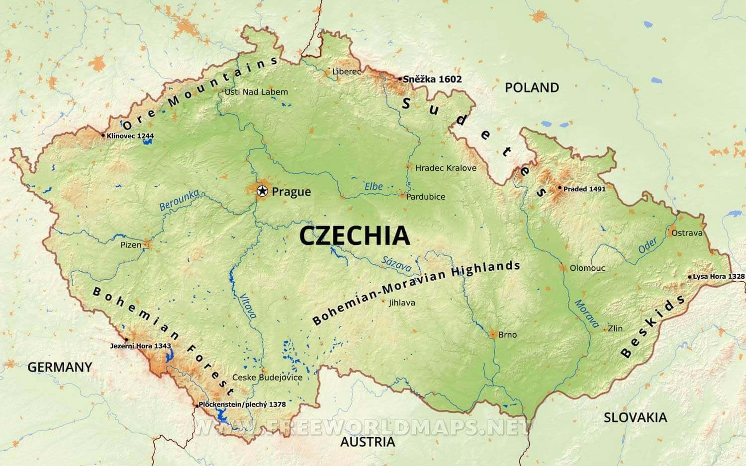 Czechia river map. Czech republic river map (Eastern Europe - Europe) to print. Czech republic river map (Eastern Europe - Europe) to download. The Czech Republic lies in the headwater area of the central European watershed. The Elbe River rises near the Czech-Polish border and sweeps southwestward across Bohemia, receiving the Jizera, Vltava, and Ohře rivers before flowing northward into Germany as its shown in Czech republic river map. The Vltava is navigable from Prague to Mělník, where it empties into the Elbe. From that point onward river traffic can travel all the way to Hamburg. The Morava River, flowing south toward the Danube (Dunaj) River, drains most of Moravia in the east.